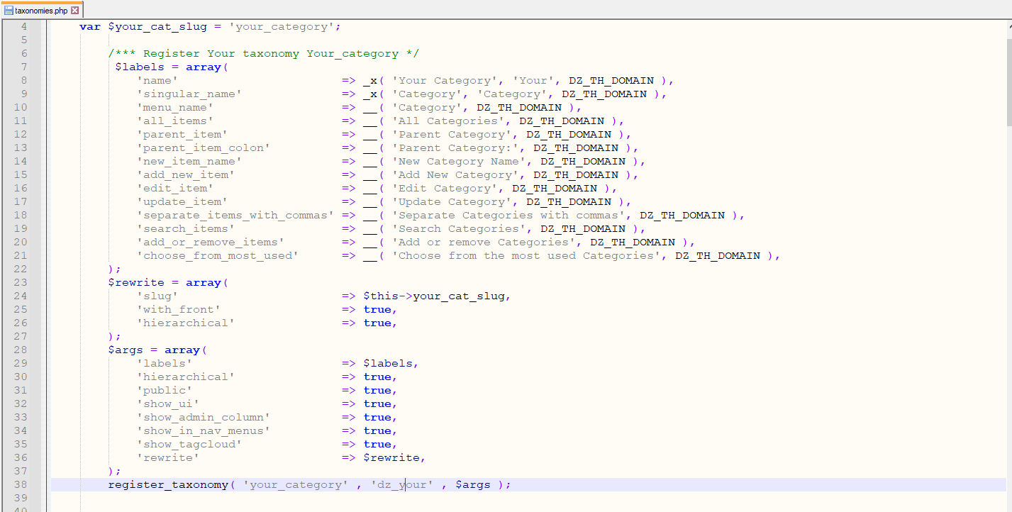 Step 1: Change taxonomy name and slug in the taxonomies.php file.