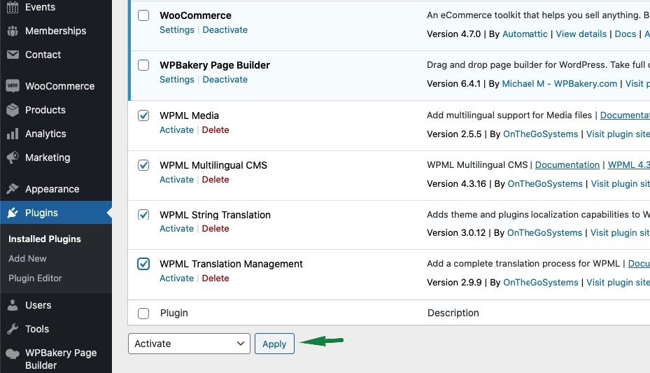Activate the WPML plugin. Follow Dashboard > Plugins and click Activate under the WPML items.