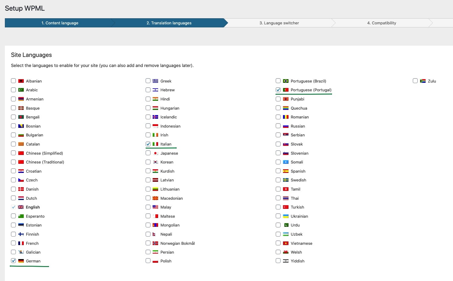 In the next step (Translation languages) add more languages to the site. Mark the languages you want to add. Then click on the Next button.