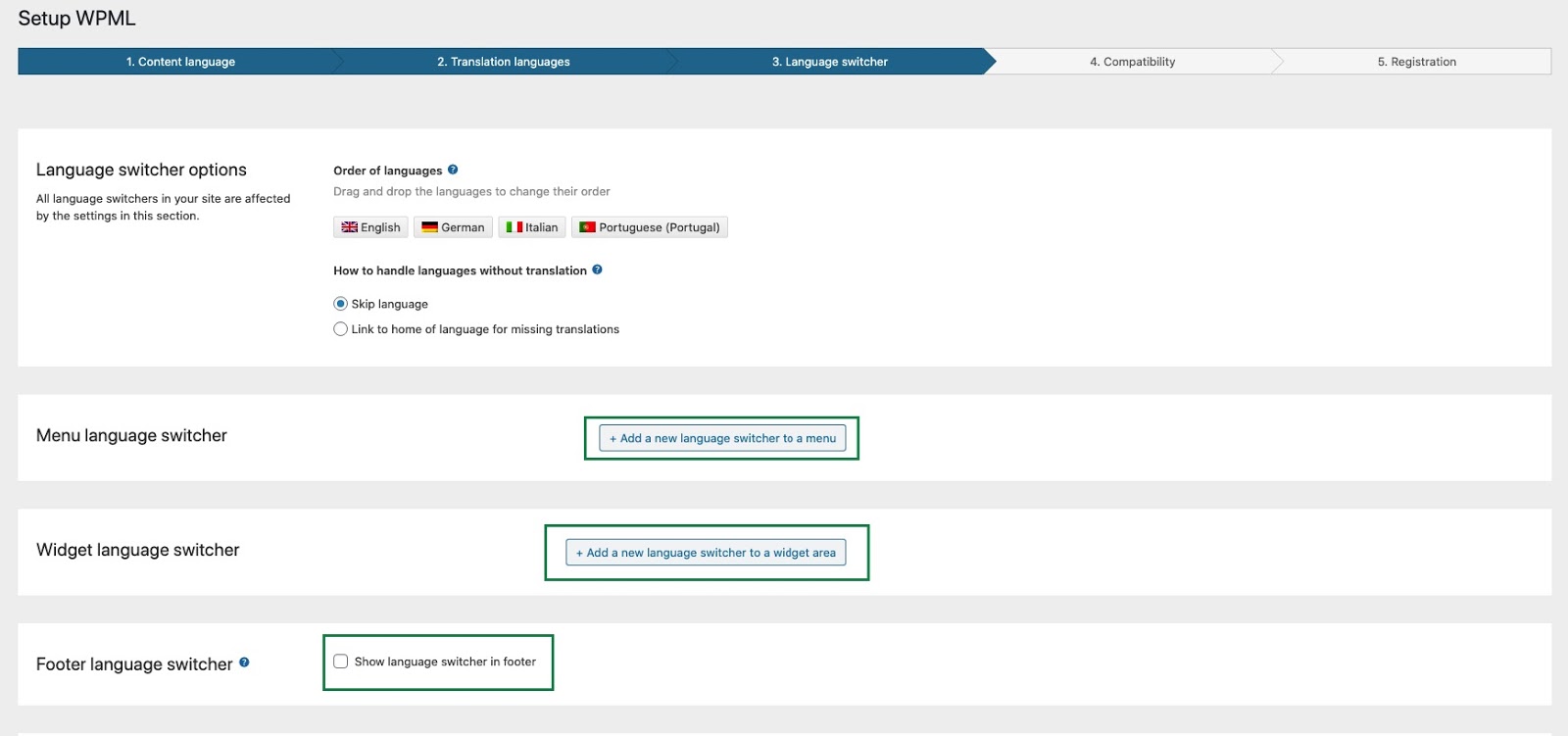 WPML’s standard language switchers include a drop-down languages list, a list of languages for the site’s footer, and a language switcher for the menu.