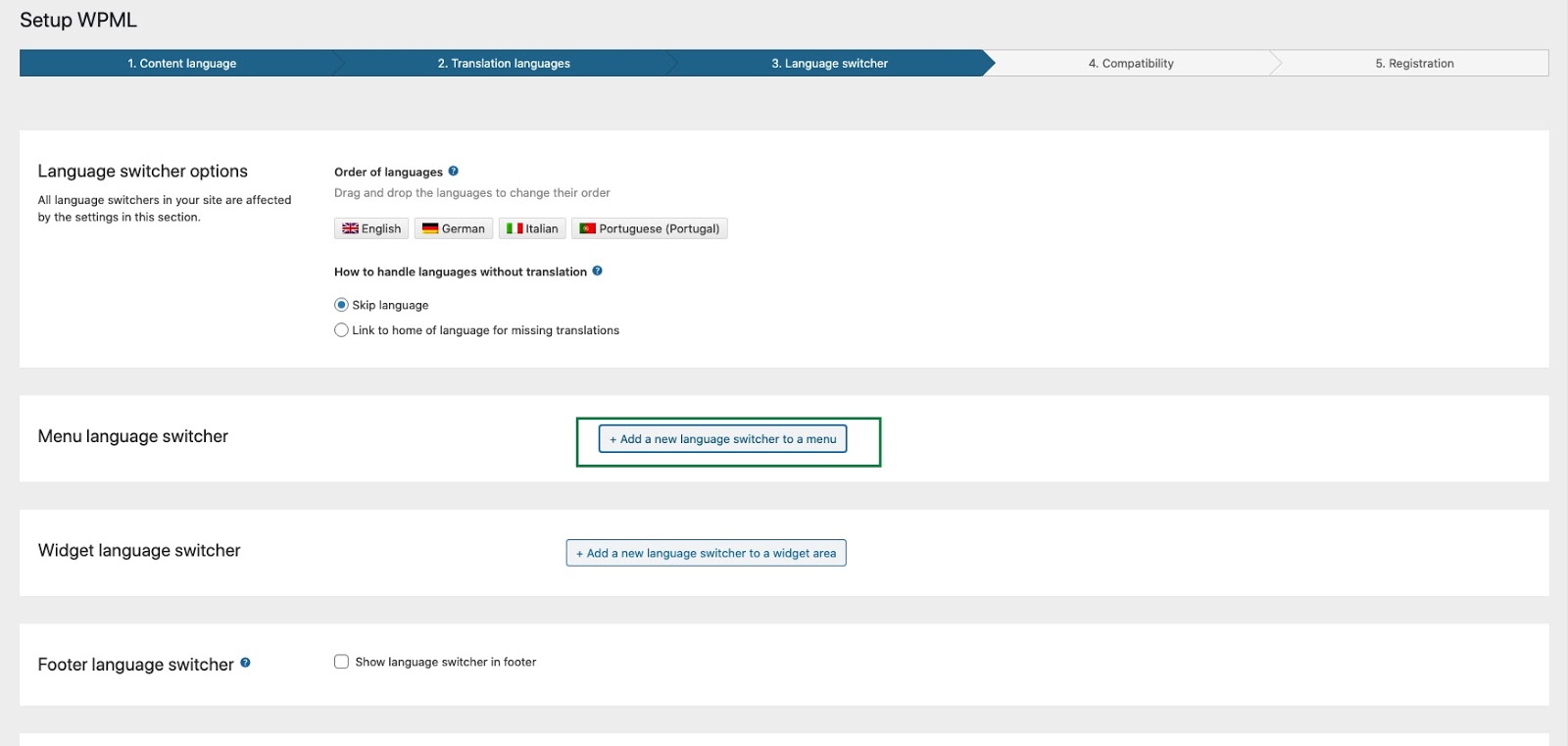 Click the “Add New Language Switcher to Menu” button to add the language switcher to the menu.