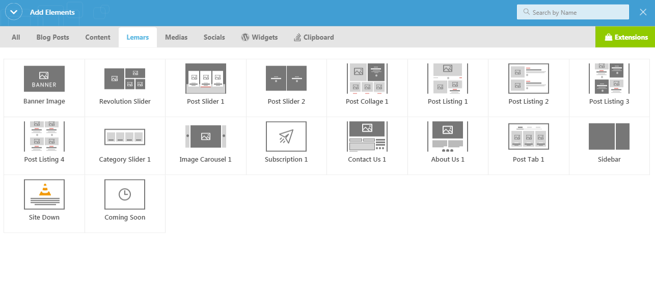 You can find and add all the available lemars KC elements for the pages of the theme as wp-admin > Pages > Add New/ edit page > click 'Edit with KingComposer' > Elements(green button area)