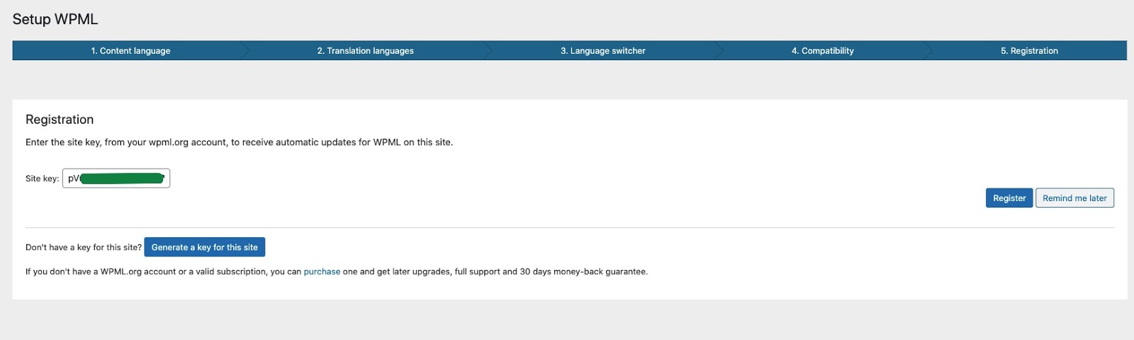 Paste the site key that you can find on your wpml.org account page and click the Register button. if you don't have a site key, then click the button to generate a key for this site.