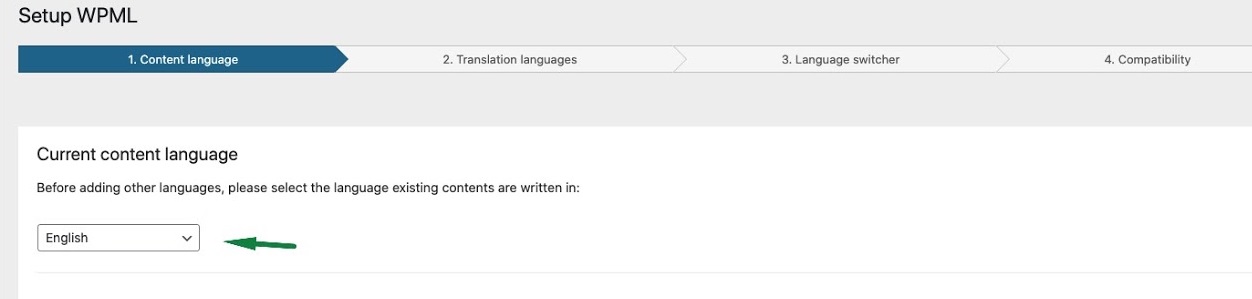 When you configure WPML for the first time, you need to choose the language of existing content. Select the language of your current website content in the Current Content Language section.