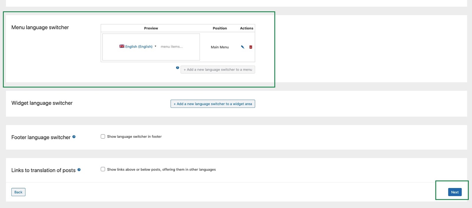 Click the “Add New Language Switcher to Menu” button to add the language switcher to the menu.